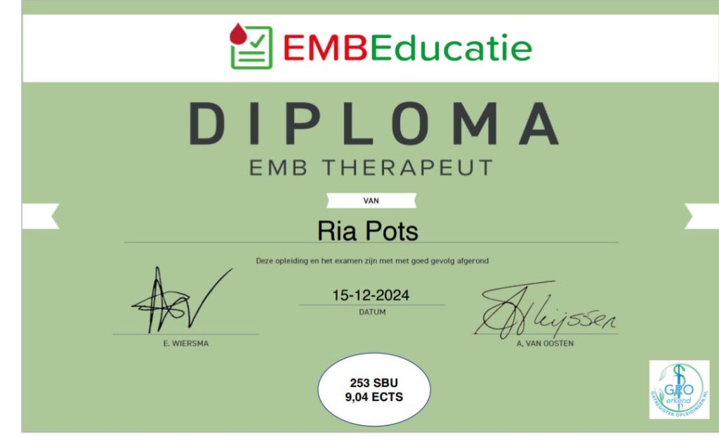 Binnenkort start ik met het afnemen van EMB-bloedtesten. Dit is een diagnostische holistische test en helpt om dieper inzicht te krijgen in gezondheid. Met deze test wordt een beetje bloed met een vingerprik afgenomen en onderzocht door de natuurgeneeskundige praktijk van de EMB-test waar dit complementair onderzocht wordt. Naar aanleiding van dit onderzoek volgt verslag en intercollegiaal advies. Met deze test kan ik mensen helpen om inzicht te krijgen in hun gezondheid, zodat zij, eventueel met bio resonantie, NEI, supplementen of andere hulp, ervoor zorgen dat hun gezondheid goed blijft.